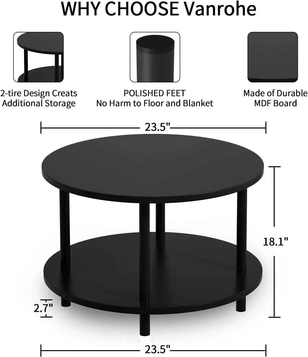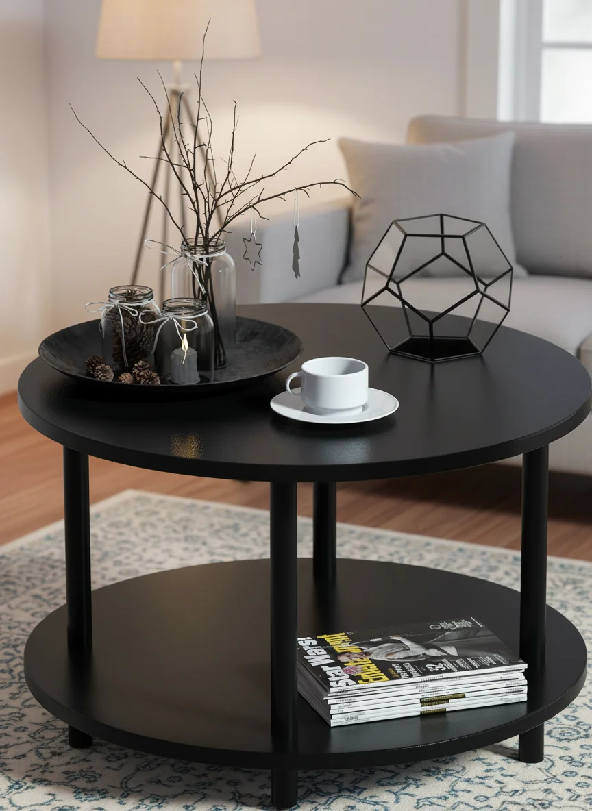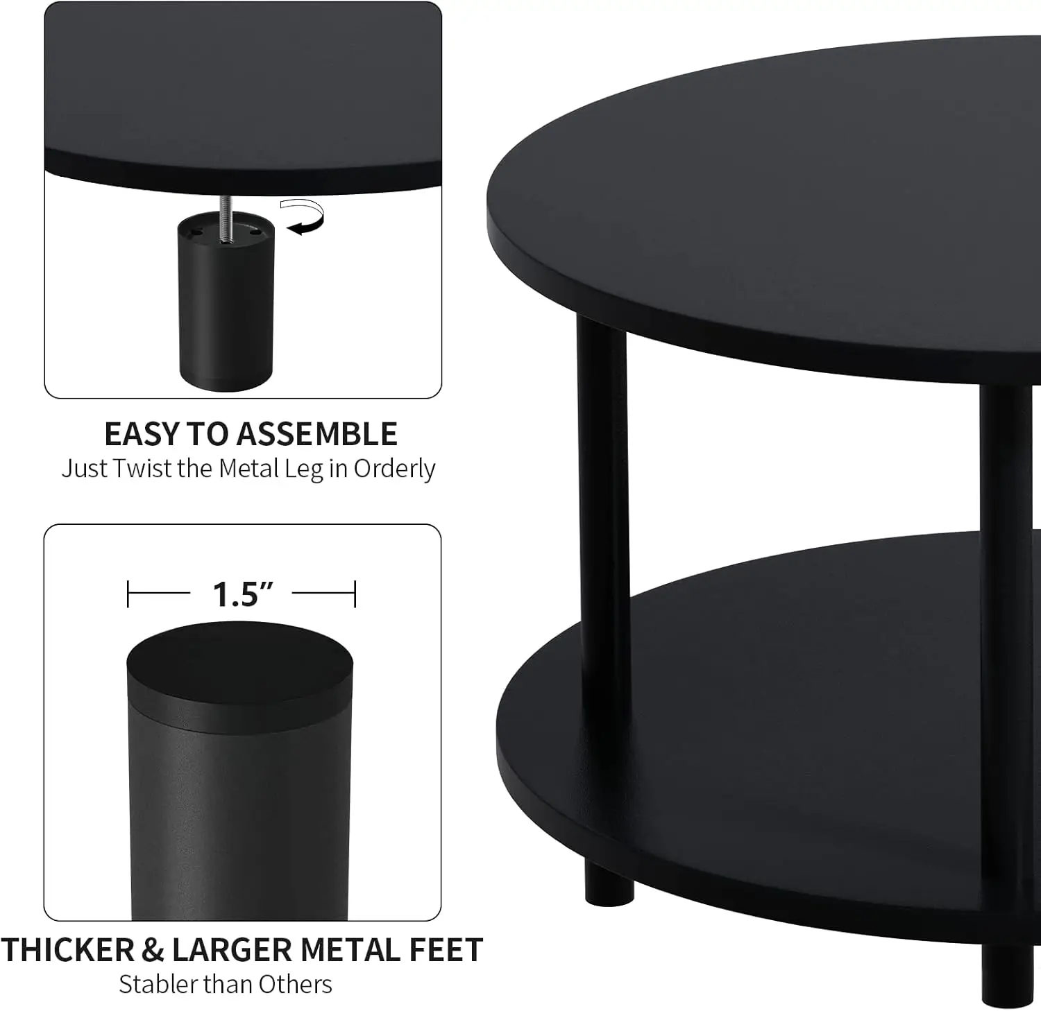 **ELEGANT AND VERSATILE DESIGN** This compact circular coffee table features a sophisticated black wood finish complemented by sturdy black metal legs, creating a timeless aesthetic that seamlessly integrates with various decor styles. Its neutral color scheme ensures compatibility with contemporary, traditional, or industrial interiors. Ideal for placement in living rooms, offices, or reception areas, it serves multiple functions as a coffee table, couch-side table, or spacious end table. **DURABLE CONSTRUCTION FOR LONG-LASTING USE** Crafted from high-quality MDF board and sturdy metal legs with a diameter of 1.5 inches, this table offers exceptional stability and strength. It supports up to 220 pounds, making it reliable for holding everyday items like remotes, drinks, and decorative pieces. The leg bottoms are fitted with polished plastic caps to prevent scratches on floors and protect rugs or carpets from damage. **SPACE-SAVING STORAGE SOLUTION** Designed for efficiency, the table includes a lower shelf identical in size and thickness to the top surface. This additional tier provides ample space for organizing books, magazines, coasters, or other essentials, effectively maximizing storage in compact areas. The wooden shelf is resistant to rust and easy to clean with a damp cloth, ensuring low maintenance compared to metal alternatives. **QUICK AND TOOL-FREE ASSEMBLY** Setting up this coffee table is straightforward and hassle-free. With pre-drilled holes and included screws, assembly requires no additional tools—simply twist the legs into place following the clear instructions. Most users can complete the process in under 10 minutes, allowing you to enjoy your new furniture without delay. **RELIABLE SUPPORT AND SATISFACTION GUARANTEE** We are committed to providing excellent customer service. If you have any inquiries about the product or need assistance during assembly or use, our support team is available to help promptly. Your satisfaction is our priority.